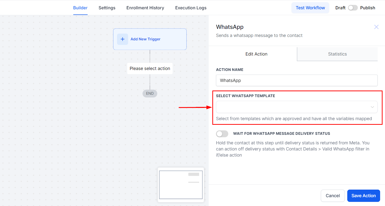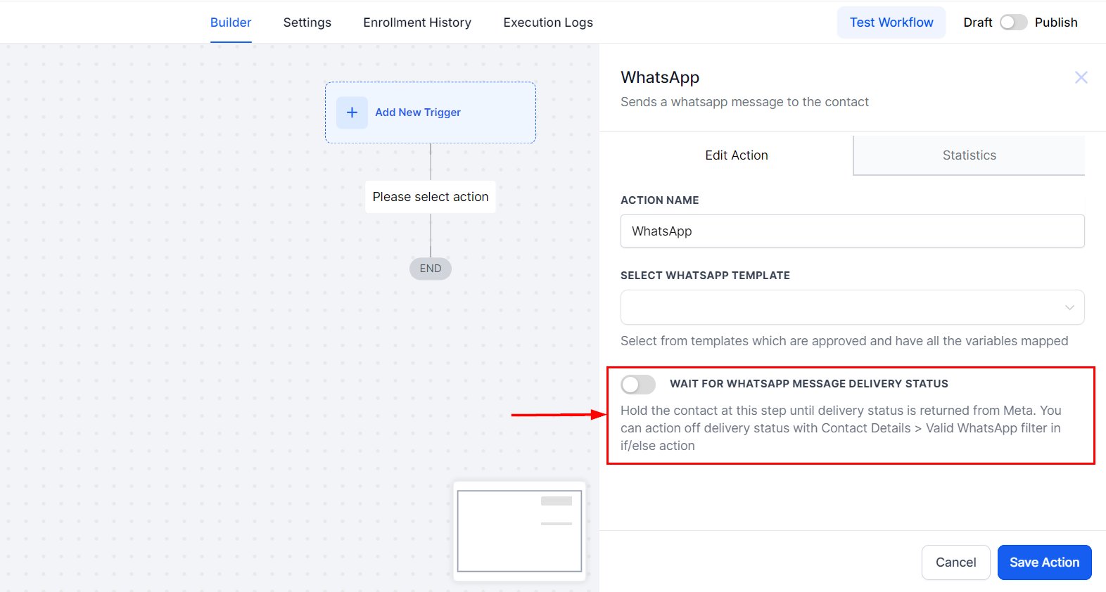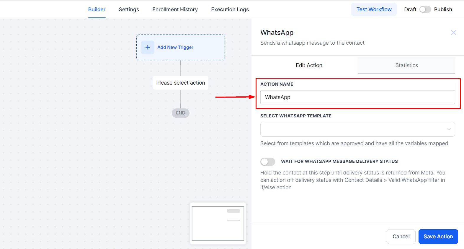 Save the action and activate the workflow to automate WhatsApp message delivery based on your defined triggers.