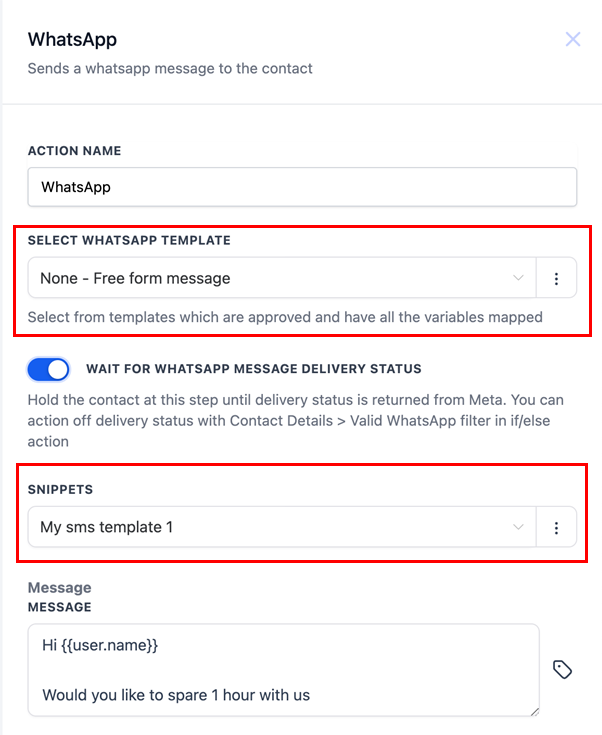 If you choose to send a free-form message, you can select a pre-existing snippet from your account. Once selected from the dropdown menu, the snippet will be available for preview and editing in the Message section. Unlike templates, snippets do not require WhatsApp approval and can be customized instantly. This flexibility makes them ideal for responding to frequently asked questions or providing quick, consistent replies during active customer support interactions.