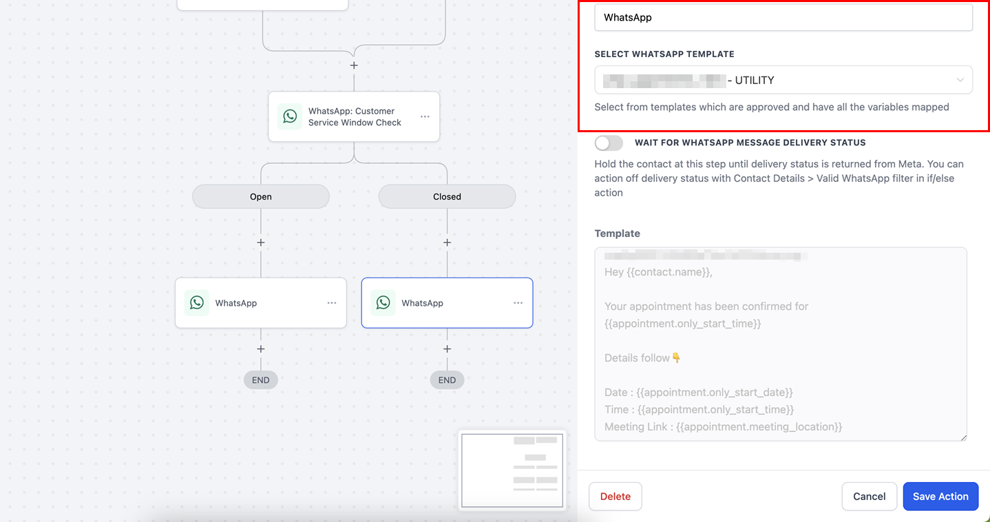 Closed Branch: Choose a WhatsApp action and select a marketing or utility template to initiate a new conversation.