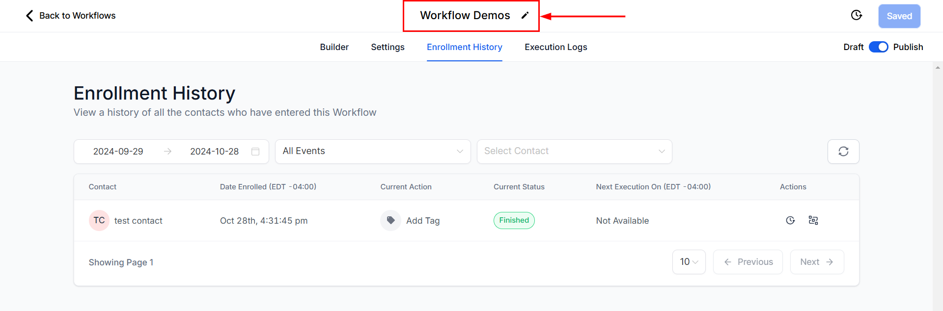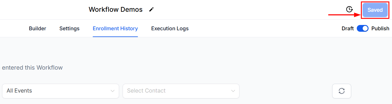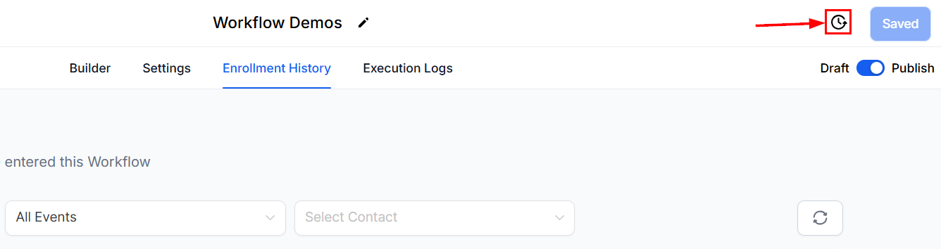 Beneath the workflow name, click on the Enrollment History option to access detailed information regarding contact enrollment and activity within the workflow.