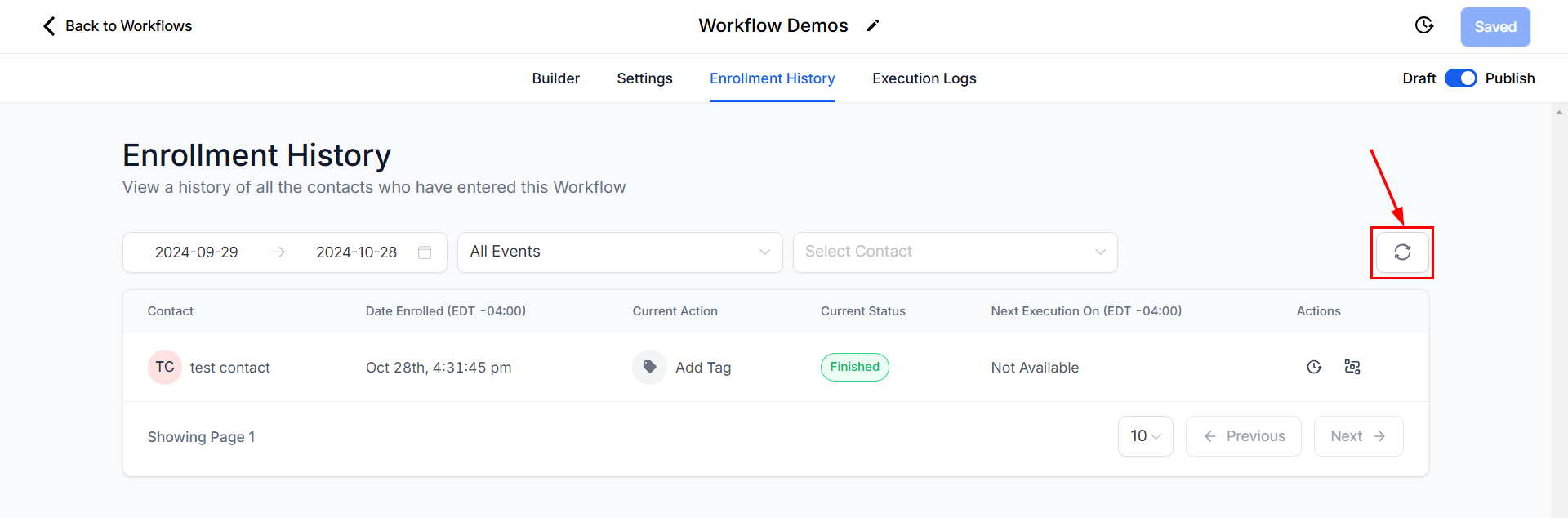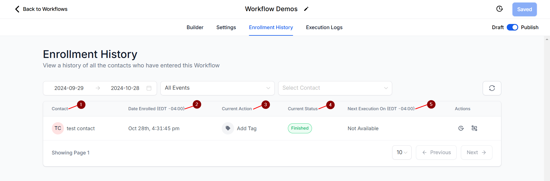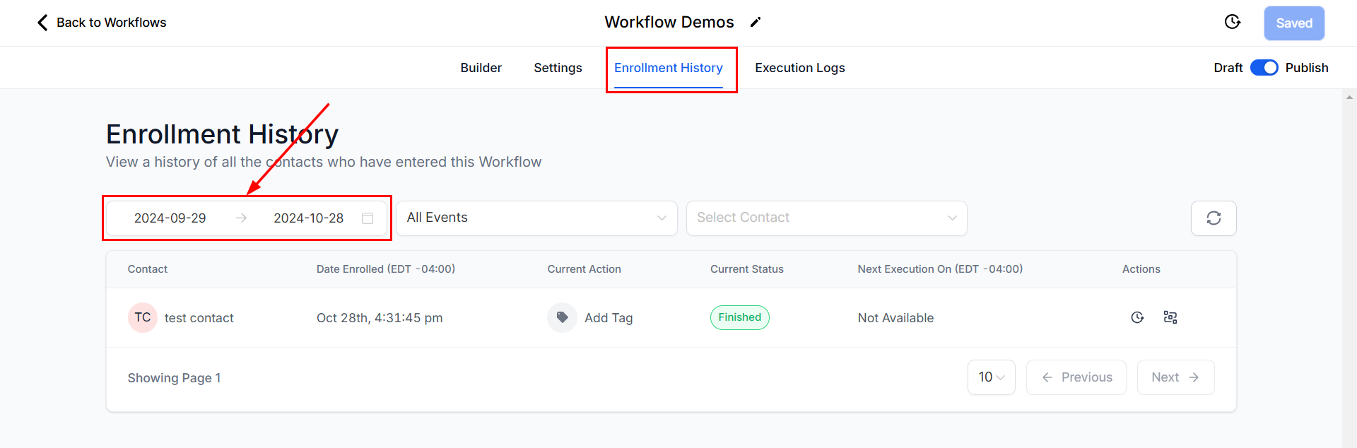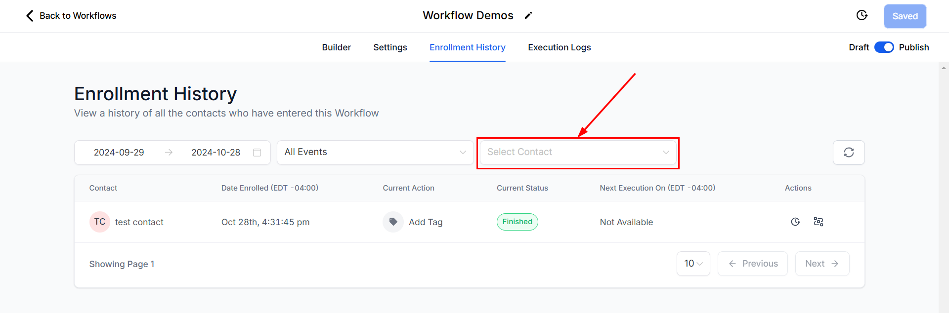The Enrollment History Tab within workflows provides a list of contacts who have entered the selected workflow. It displays important details, including the contact name, the date each contact began the workflow, and their current status, and allows you to access additional information such as their contact path and execution history.