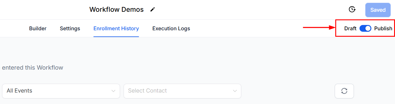 Toggle between draft and publish modes for workflows. In publish mode, the workflow is active and will perform the configured actions to contacts who meet the trigger criteria. In draft mode, the workflow remains inactive.