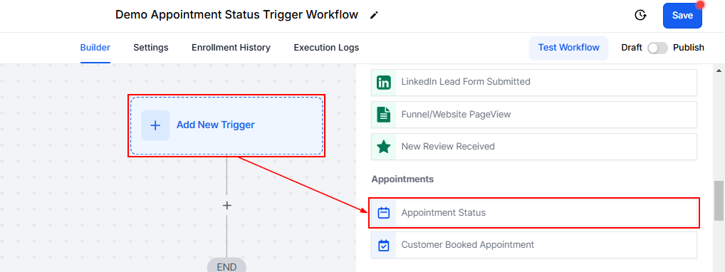 The Appointment Status Trigger is designed to activate when an appointment is being scheduled, or the status of an appointment has changed. This will trigger your workflow based on the appointment status filter the user chooses. This feature enables businesses to create more specialized workflows with varying degrees of automation and customization based on the filters used.