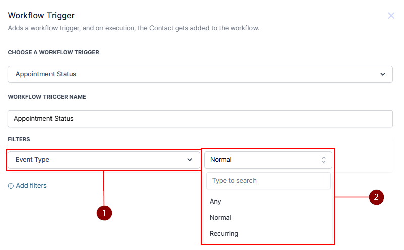 With the “Event Type” filter, you can select the event type you want to trigger the workflow; Normal, Recurring, or Any of the two to fire the trigger. This is the first trigger filter you choose from; it's set as default.