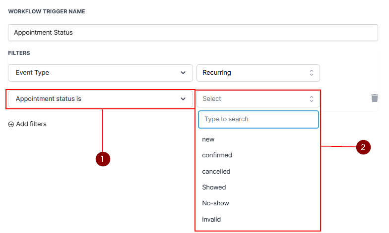 The "Appointment Status Is" filter, lets users select specific triggers to activate based on the status of an appointment. Users can choose to trigger the workflow when: