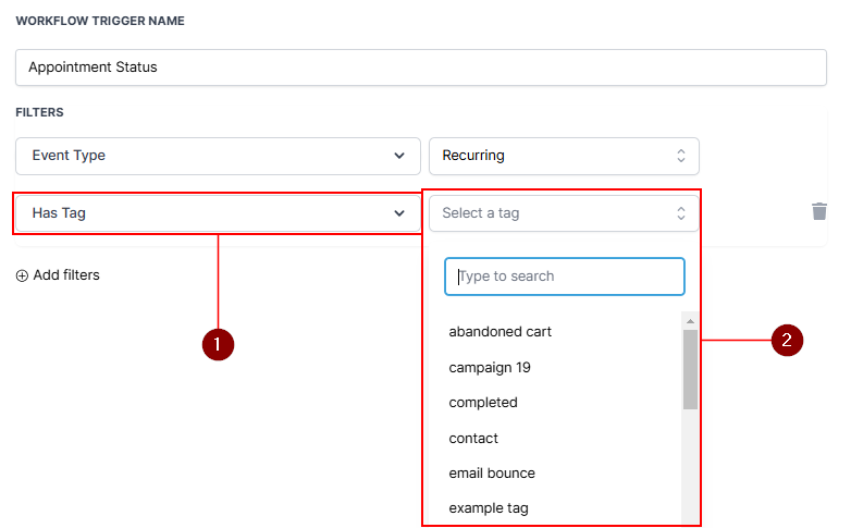 You can use the “Has Tag” filter to trigger the workflow when an appointment status has changed to a contact with a specific tag. Once you've selected the Has Tag filter, you will see a dropdown appear where you can select the tag you would like to use.