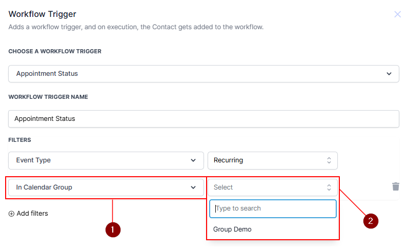 You can also use the In Calendar Group filter to trigger the workflow when the appointment status has changed in a specific calendar group. Once you've selected the In Calendar Group filter, you will see a dropdown where you can select the Calendar Group you would like to use.