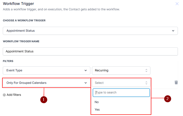 The Only For Grouped Calendars filter allows you to choose whether the workflow should only be triggered for group calendars. Once you've selected the “Only For Grouped Calendars” filter, you can select “Yes or No” in the dropdown.