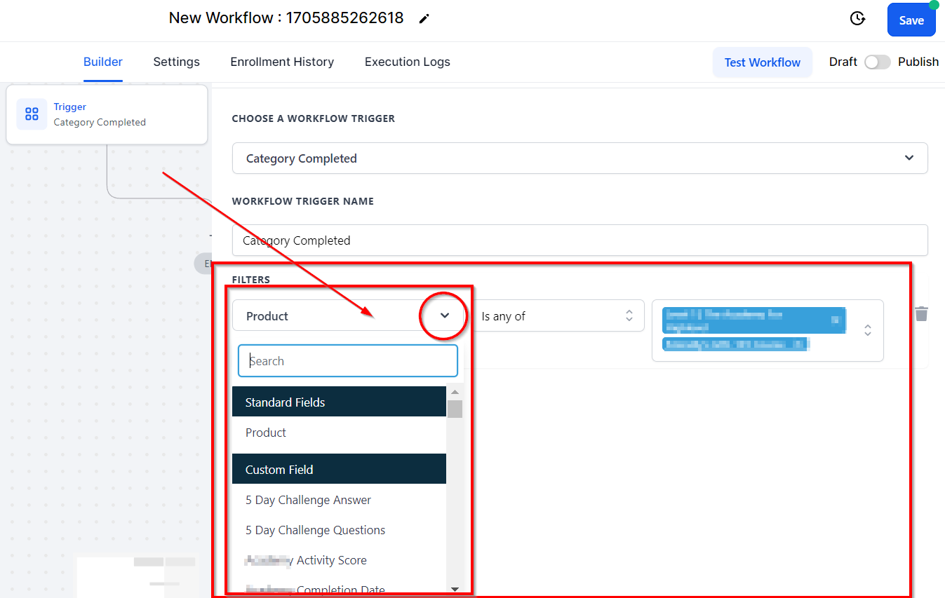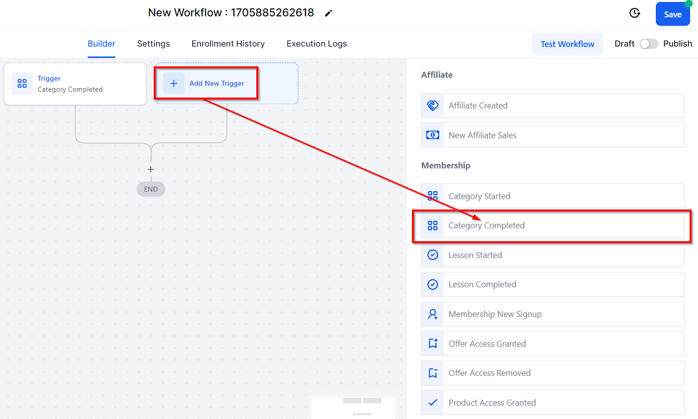 The Category Completed workflow trigger is activated when a category of particular products is completed. To initiate this process, click the Add New Workflow Trigger option and choose Category Completed from the available selections. By utilizing this trigger, you can effectively monitor the progress of product categories and implement appropriate actions, leading to enhanced project management and timely product development.