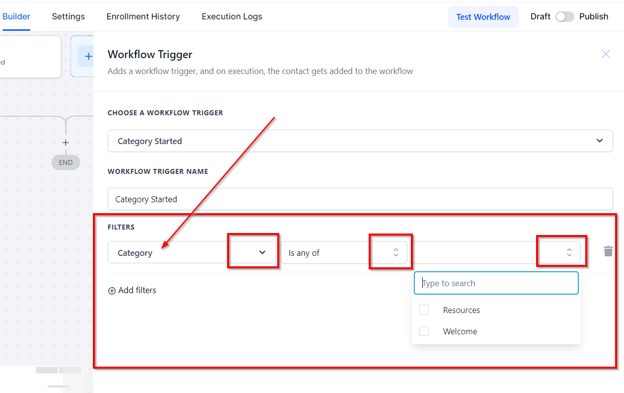 You can add filters from here by clicking Add Filter and selecting Product. Next, you will need to select βIs any ofβ or βIs none of.β Your next step in setting up your trigger is to select the product category youβd like to trigger your workflow.