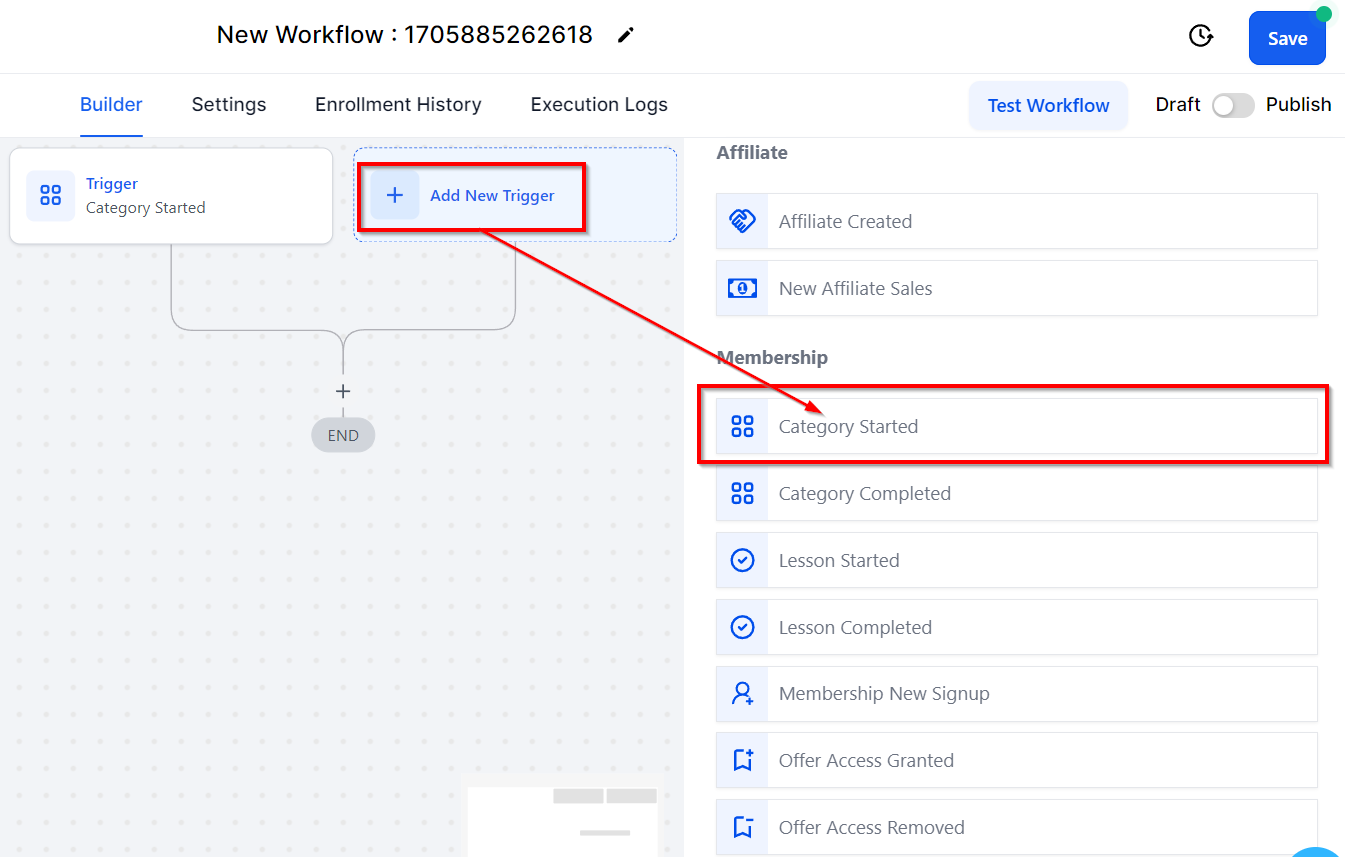 The Category Started workflow trigger is activated when you start a category of particular products. To initiate this process, click the Add New Workflow Trigger option and choose Category Started from the available selections. By utilizing this trigger, you can effectively monitor the start of your product categories and implement appropriate actions, leading to enhanced project management and timely product development.
