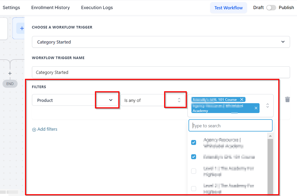 Choose the specific category the product is in in the course. Again you can select 'Is any of' or 'Is none of' and select the product category for your filter.