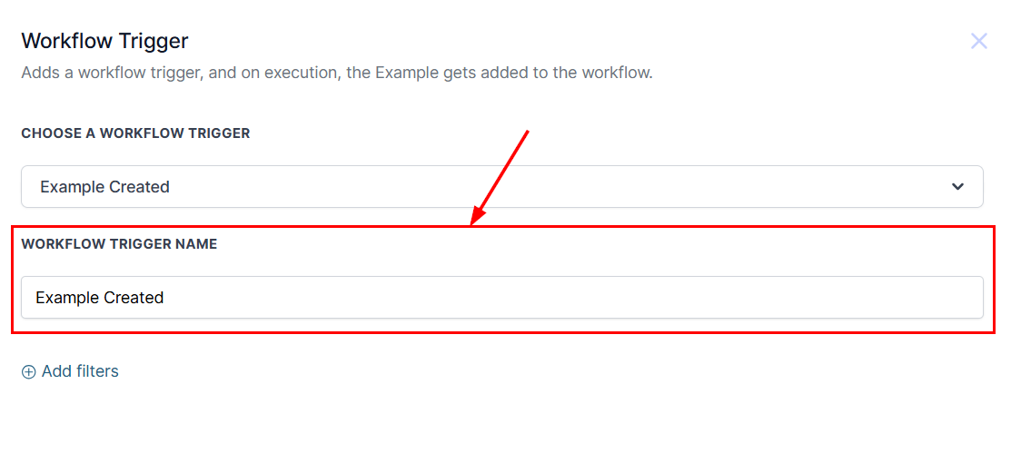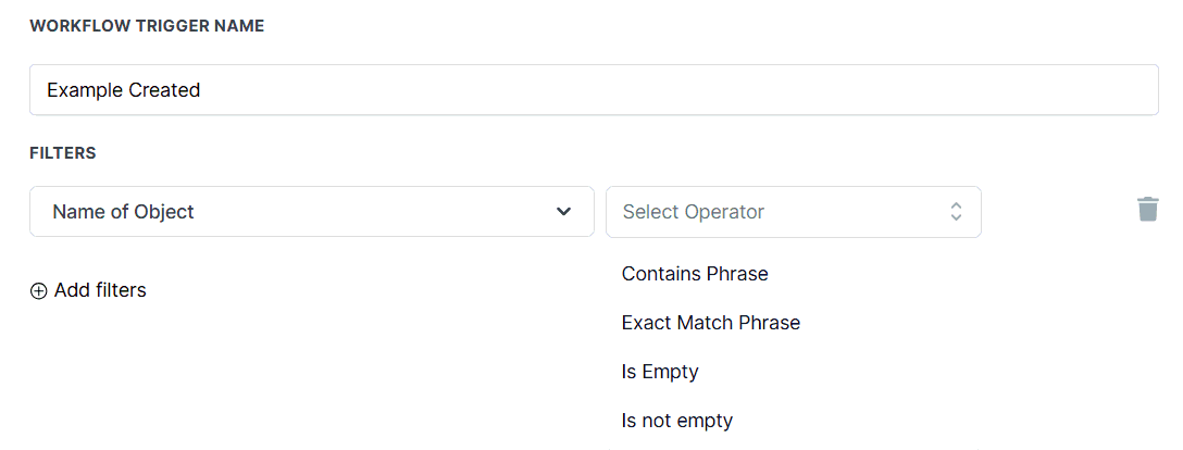 Add filters to specify the conditions by which the workflow should be activated. You will be able to filter by the primary object field name and the name of the object.