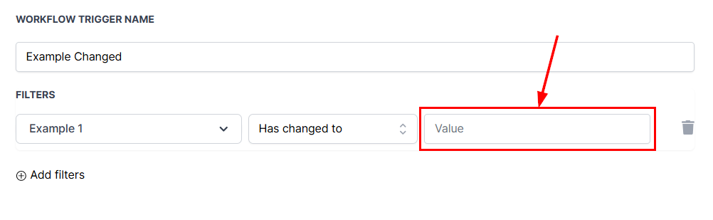 For operators that rely on specific changes, input the desired phrase in the value field. This field supports alphanumeric characters and symbols, allowing you to define precise criteria for the trigger. Ensure the input accurately represents the conditions needed for the workflow to execute effectively.