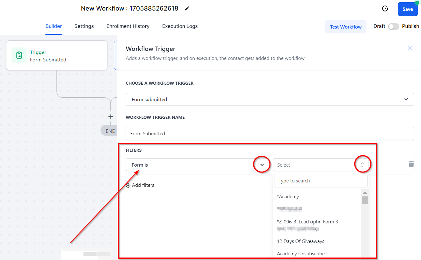 To filter your results using a specific form, click the Add Filters button and select Form Is from the dropdown list. Here you can select the form from your list that youβd like to use to trigger your workflow. Utilizing this workflow is great for setting up auto-replies via SMS or email notifications to customers, as well as notifications to team members when a form is filled out that they need to follow up on.