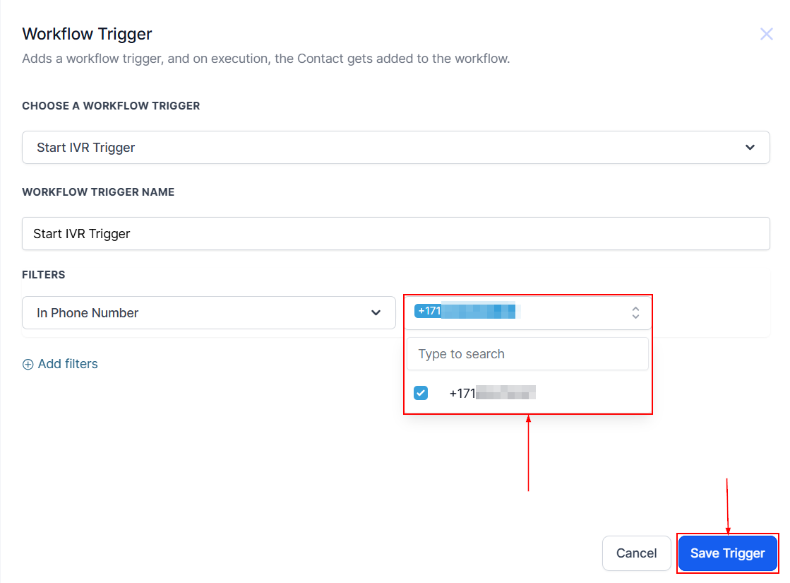 Remember to Add the phone number registered in your CRM and, Save the trigger to activate the entry point.