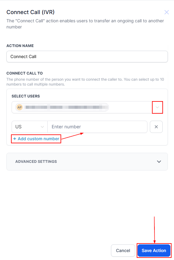 Select the user you want to redirect the call to by clicking on the downwards pointing arrow, or a custom number by typing it after clicking on β+Add custom numberβ.