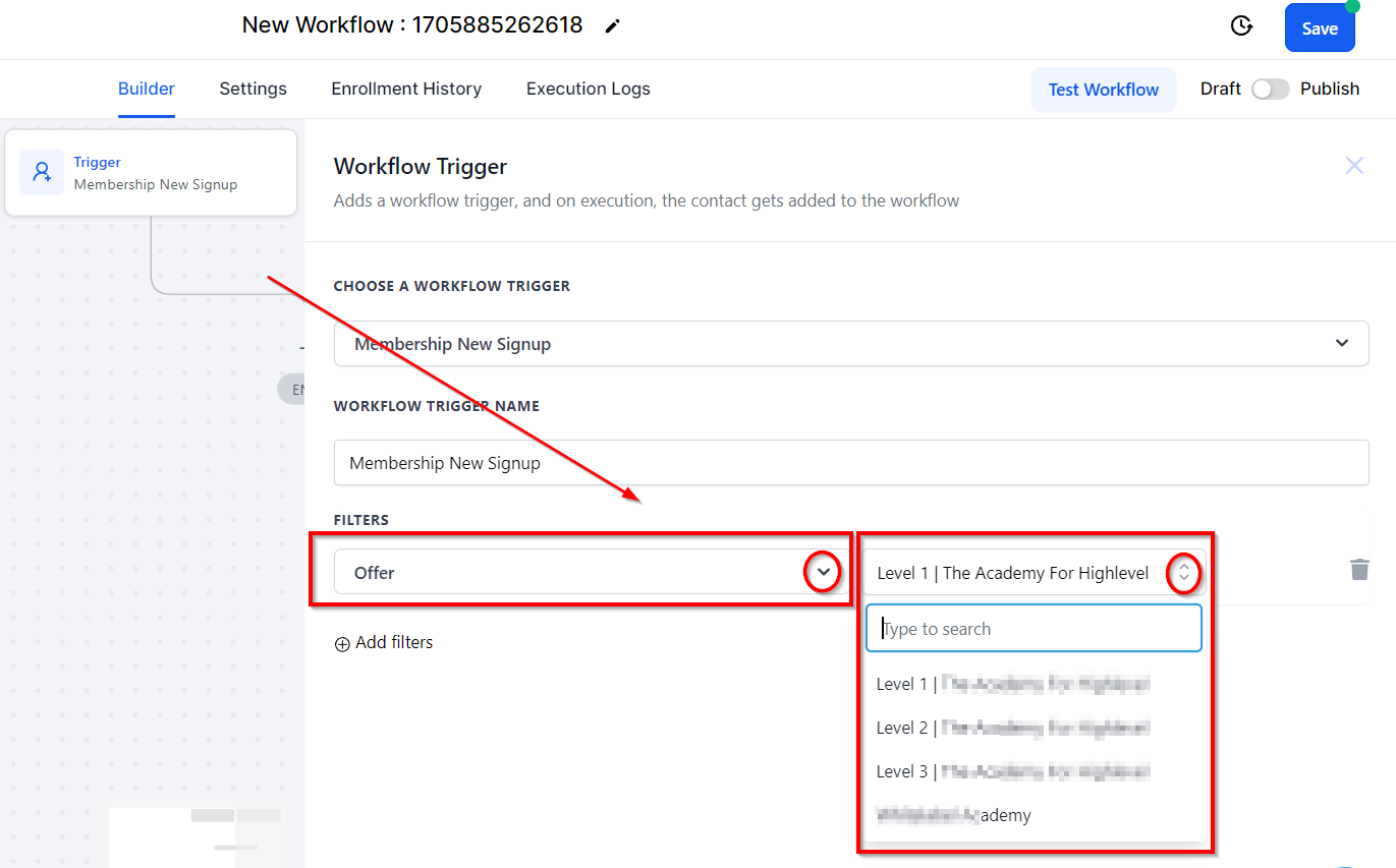 To further filter your trigger, select Add Filters and click on Offer. A drop-down menu will appear for you to select the membership type. Once youβve selected your filters for your trigger, click on the green Save Trigger button in the bottom right corner.