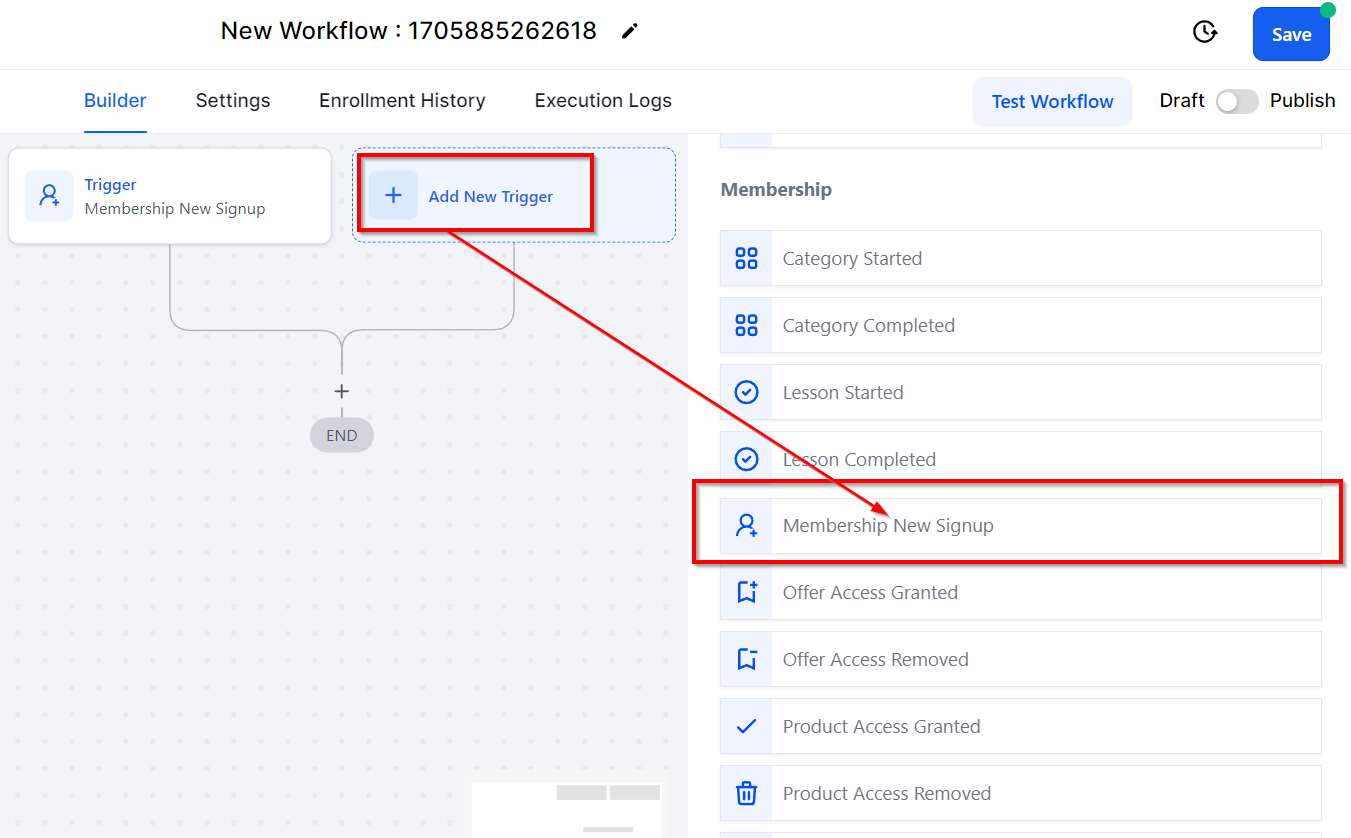 The Membership New Signup trigger initiates your workflow when a customer or potential lead subscribes for a membership. To set this up, click the Add New. Workflow Trigger option and choose Membership New Signup from the available choices. By implementing this trigger, you can effectively manage new member signups, streamline onboarding processes, and ensure a seamless experience for your organization and the newly enrolled members.
