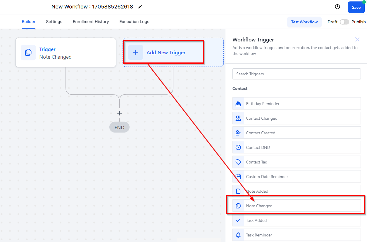 Once you've selected a trigger, you can configure the workflow's details. Here, select the Note Changed trigger under the Contact section.