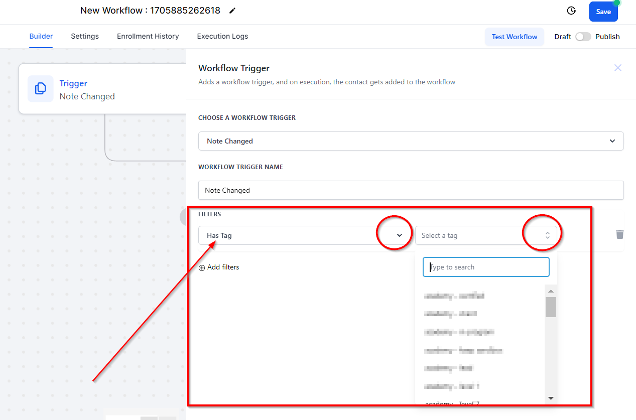 By selecting the "has tag" filter, the workflow will only fire when a note is added to a contact who has the specified tag.