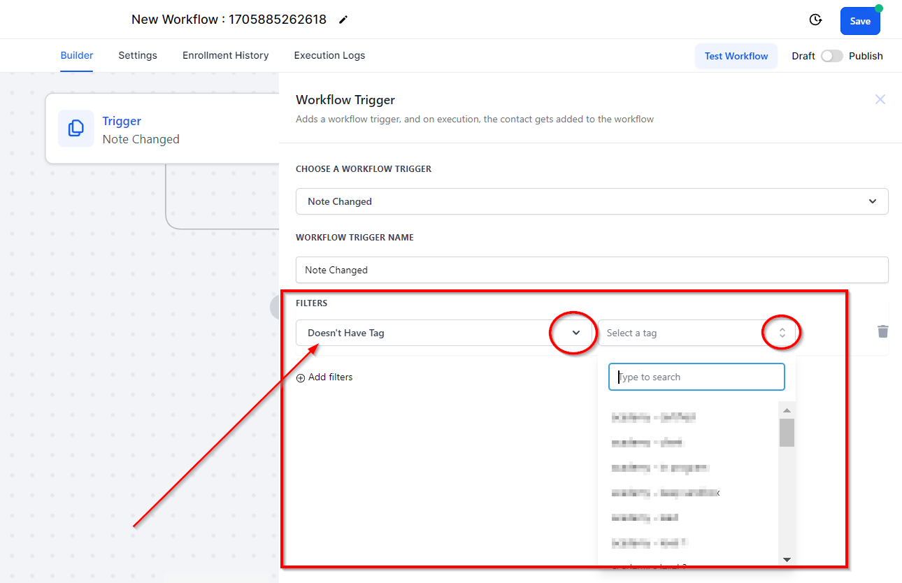 By selecting the "Doesn't Have Tag" filter option, this workflow will ONLY be triggered when you change a note for a contact that doesn't have the tag you specify in the filter area.