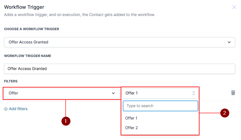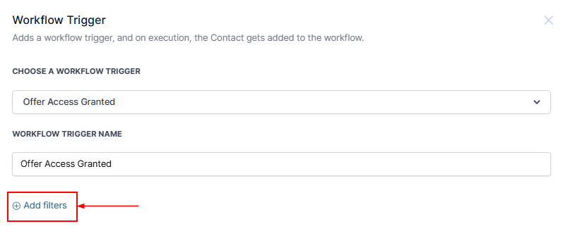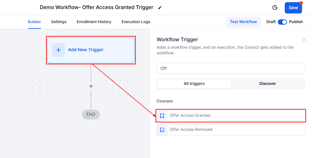 Within the Workflow builder click on the "Add New Trigger" button and select the "Offer Access Granted" option from the available list.