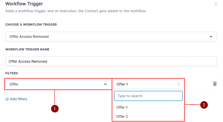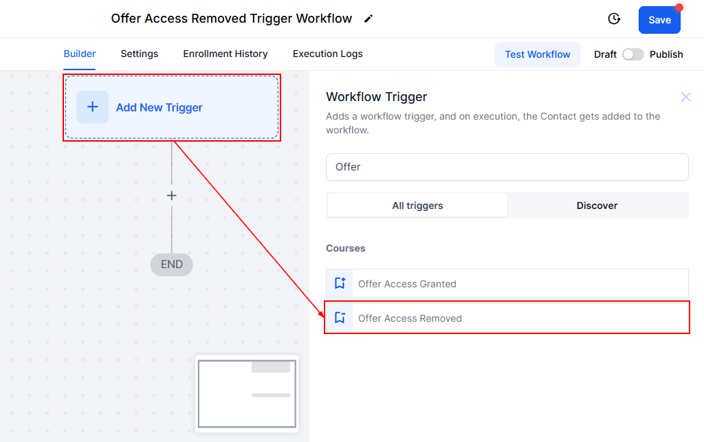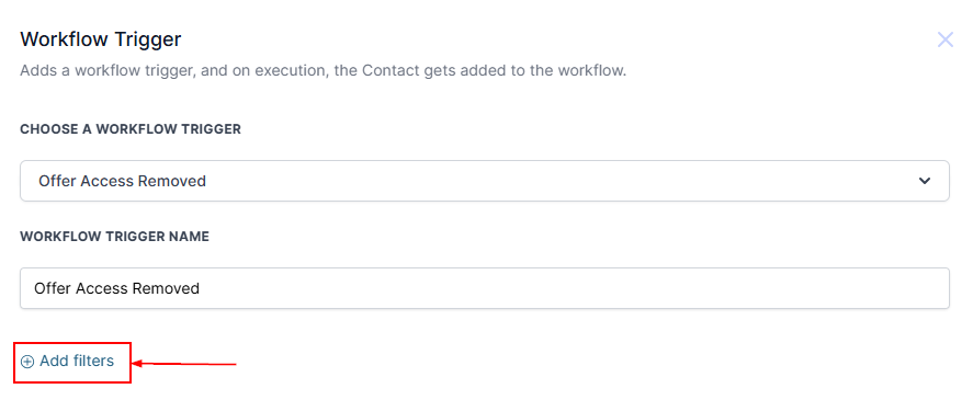 Within the workflow builder, click the βAdd New Triggerβ button and choose the βOffer Access Removedβ option from the provided selections.