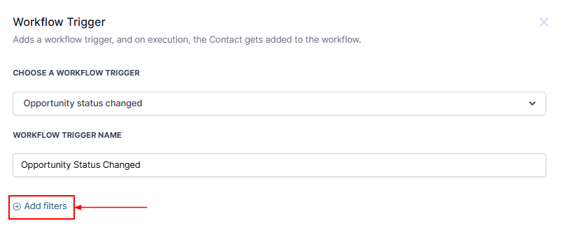 Selecting the In Pipeline filter will activate the workflow only when an opportunity card in a specific pipeline moves from one status to another. For instance, if an opportunity card in the Appointment pipeline moves from open to abandon status, this filter will trigger the workflow.