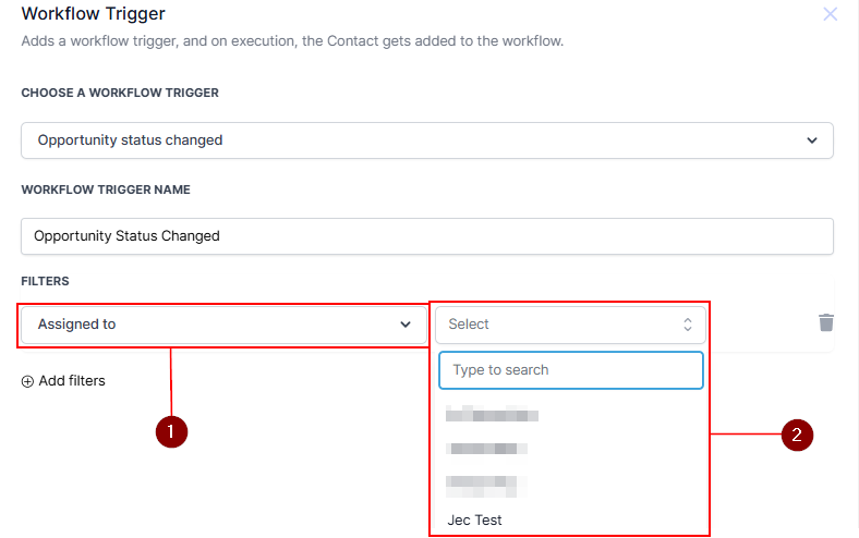 The "Assigned To" filter allows you to trigger the assignment of a Contact to a User based on a condition of your choice. Simply select a team member from the dropdown to select the Assigned To.