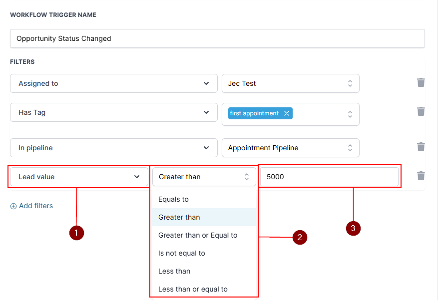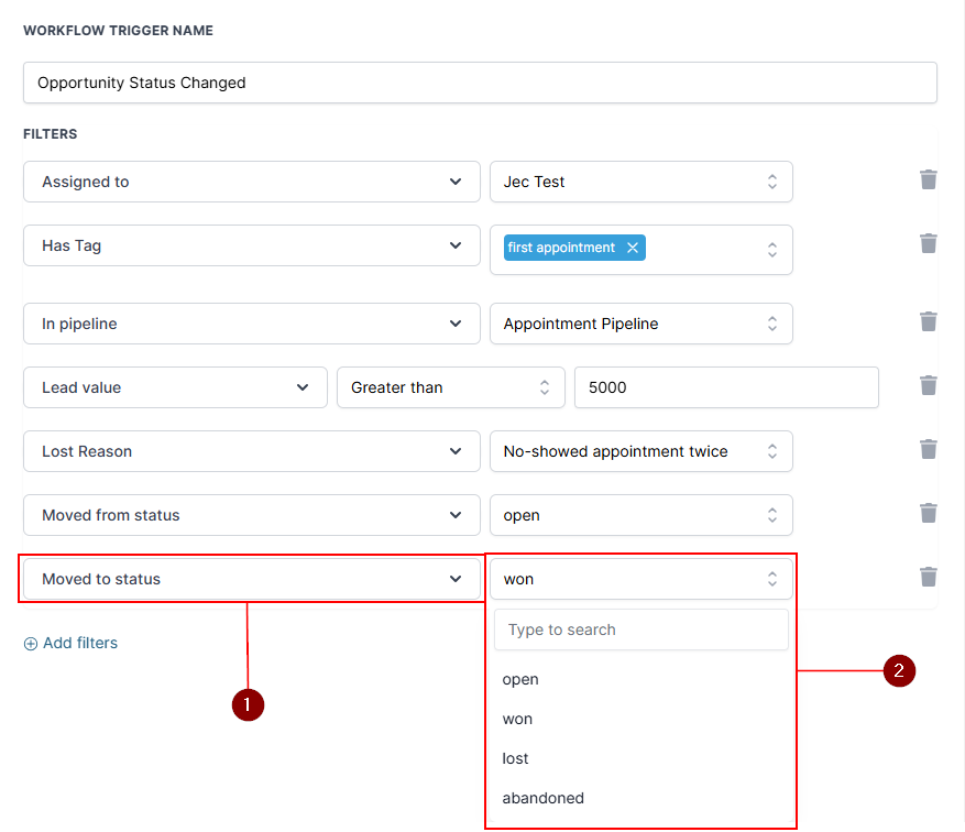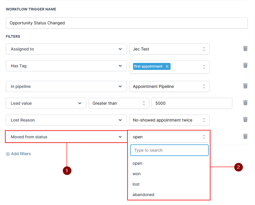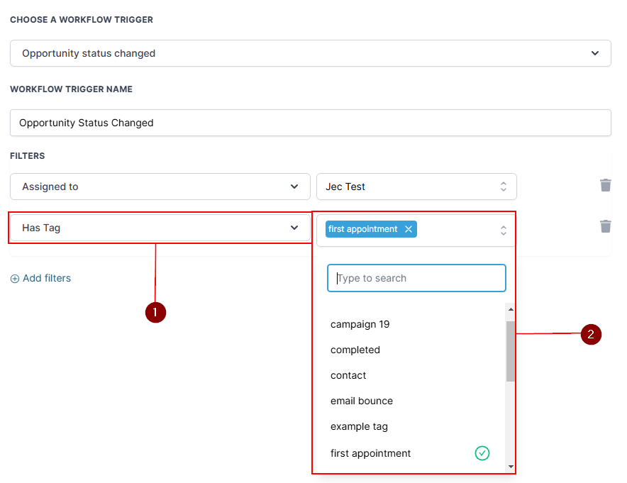 In the filter options, choosing "Has tag" will trigger the workflow when an opportunity card with a specific tag moves from one status to another. For instance, this filter will only activate the workflow when an opportunity card with a First Appointment tag moves from the open status to the won status.