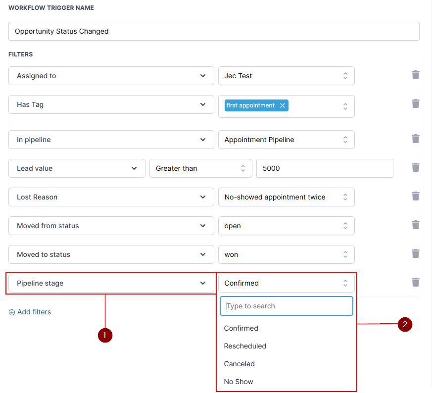 For instance, if Confirmed is chosen in the Appointment pipeline, this filter will only activate the workflow when a customer moves to that stage.