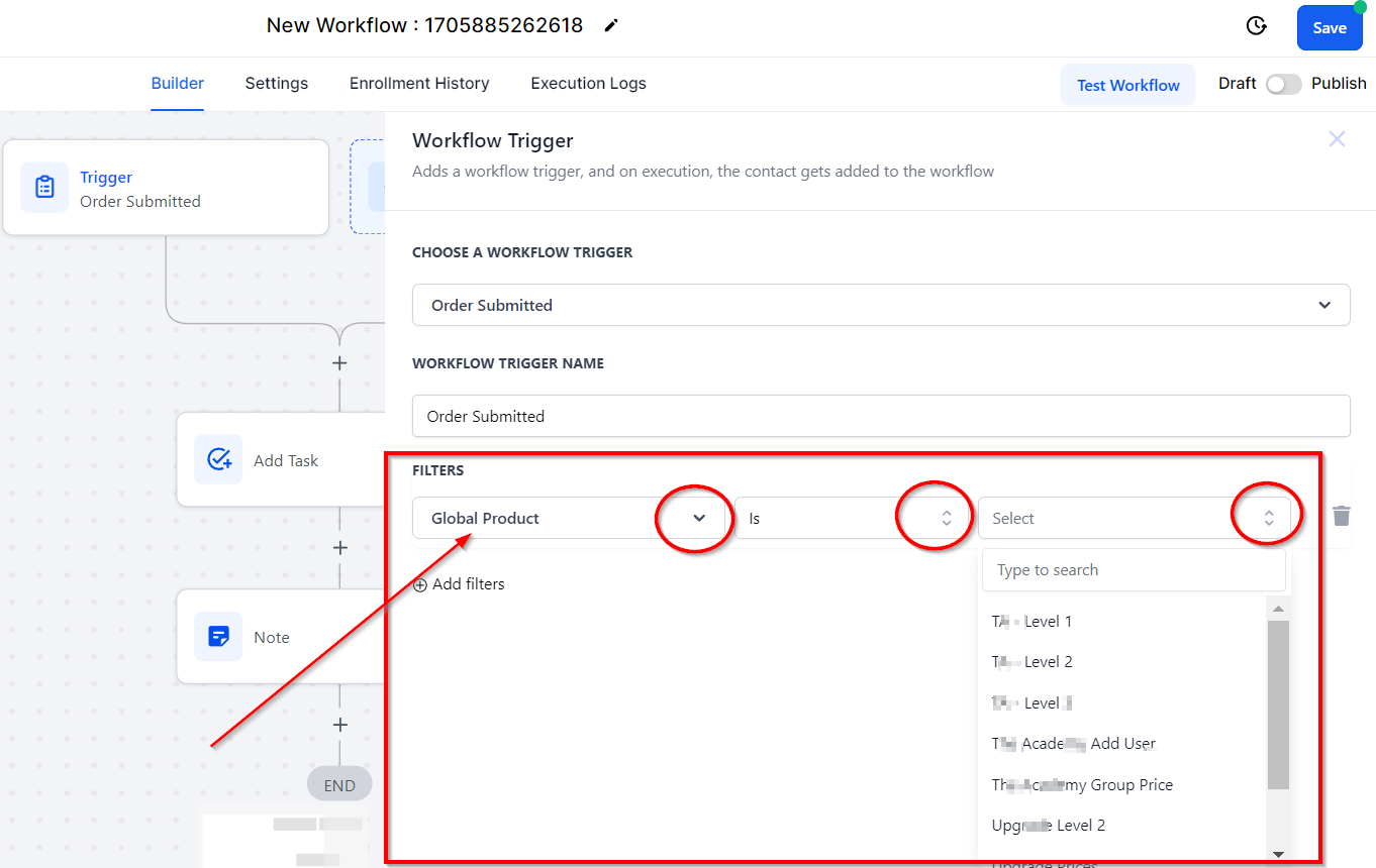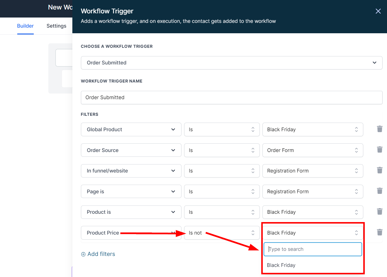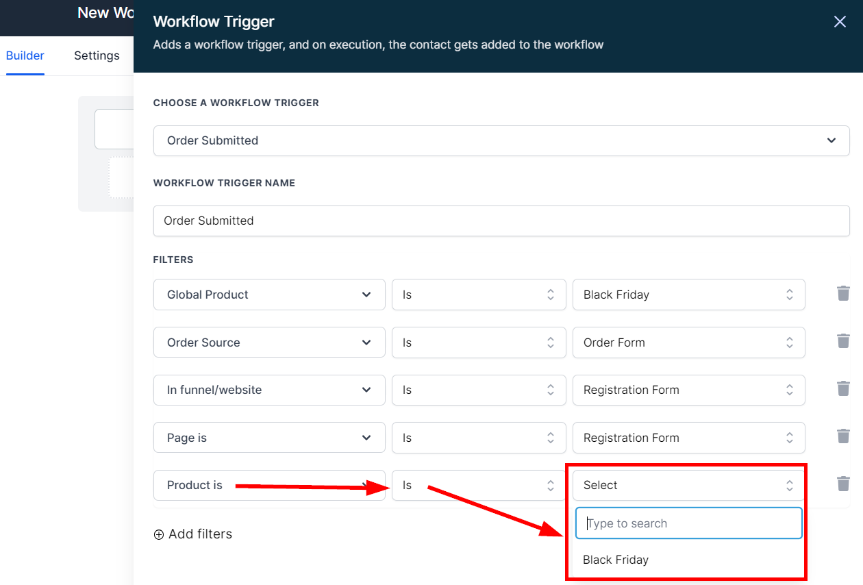 The "Product Is" filter option in this trigger could be used when you want a specific product in your funnel or website to trigger the workflow when a customer fills it. You can choose 'Is' or 'Is not' from the second dropdown, then select a product from the third dropdown.
