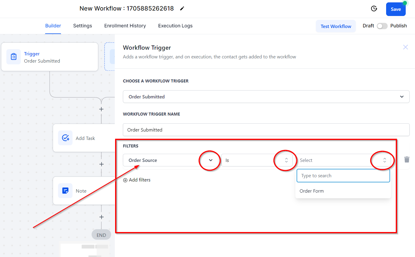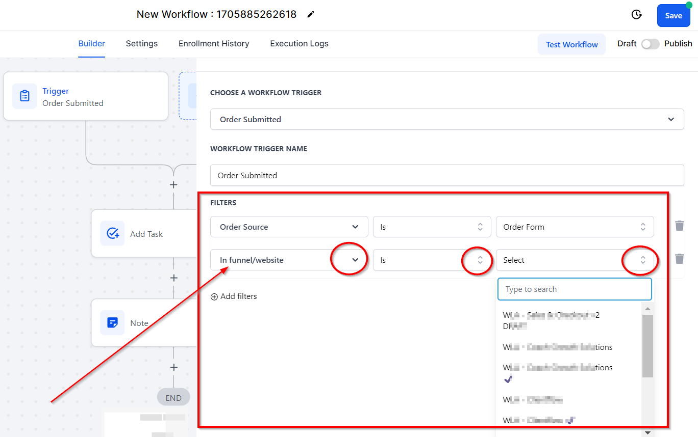 Selecting the "In funnel/ website" filter option will ONLY trigger this workflow when a form is submitted through a specific Funnel or website. Select 'Is' or 'Is not' and then select the funnel or website from the third dropdown.