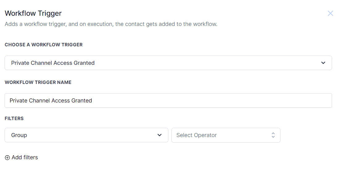 The Private Channel Access Granted Trigger allows you to automate processes based on a user gaining access to one of your Community Private Channels such as sending follow-up emails, notifying team members, or providing access to another channel.
