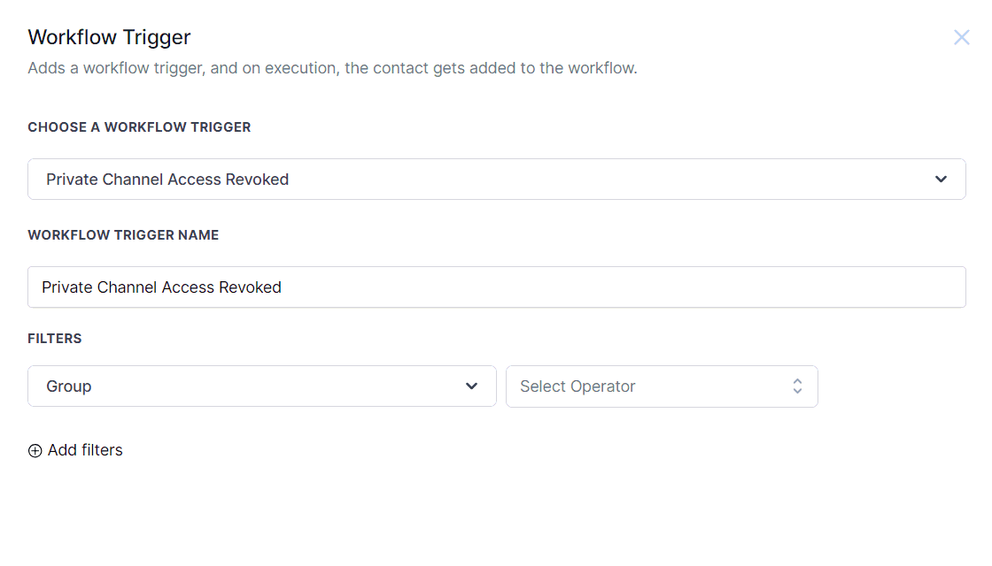 This action will display the trigger list, where you will need to locate and select the Private Channel Access Revoked trigger.