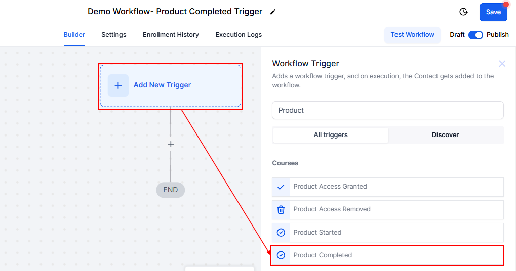 To configure the Product Completed trigger, click on the βAdd New Triggerβ button and choose the Product Completed option from the available selections.