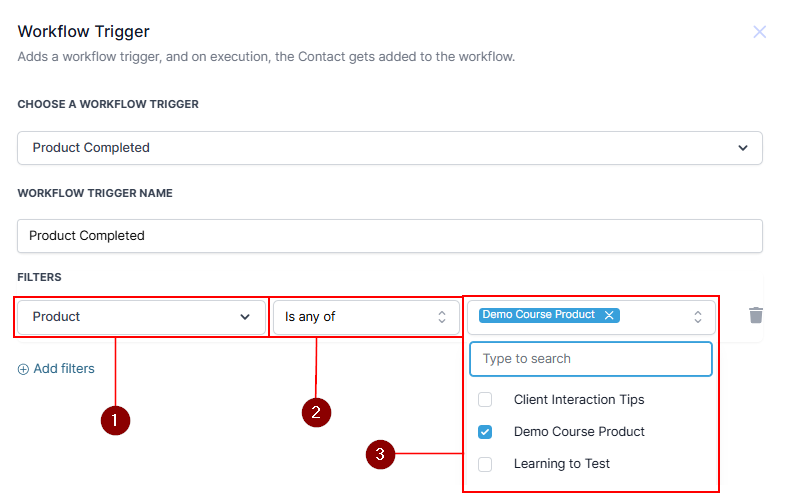 The Product Completed trigger is activated when a customer fully completes their access to a specific product, initiating a designated workflow. This automation enables businesses to efficiently monitor and manage product completions, ensuring no milestone goes unnoticed.