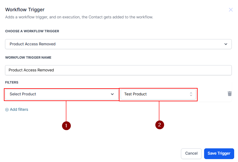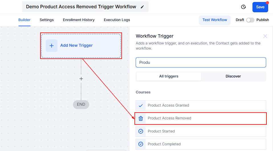 To enable this trigger, click on the "Add New Trigger" button, then search and choose the โProduct Access Removedโ option from the available choices.
