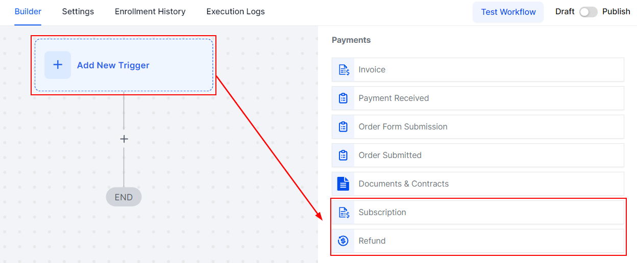 Subscriptions and refunds are two big tells of how a customer's journey is going, they may be the perfect point to engage more with them or the moment to cut things off. But you may not have the time to keep checking on those details with each customer, right? That's where workflows come in handy, especially with the βSubscriptionβ or βRefundβ triggers.With their help, you can step up full workflows for your contacts to experience as soon as their status changes. To start, add a new trigger, you can find these two under Payments.