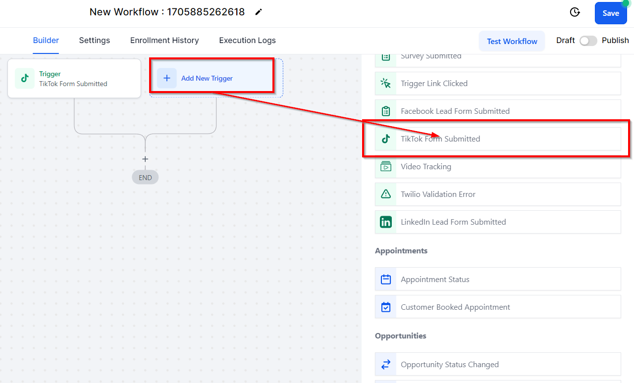 To get started setting up your workflow, click on Add New Workflow Trigger and select TikTok Form Submitted.