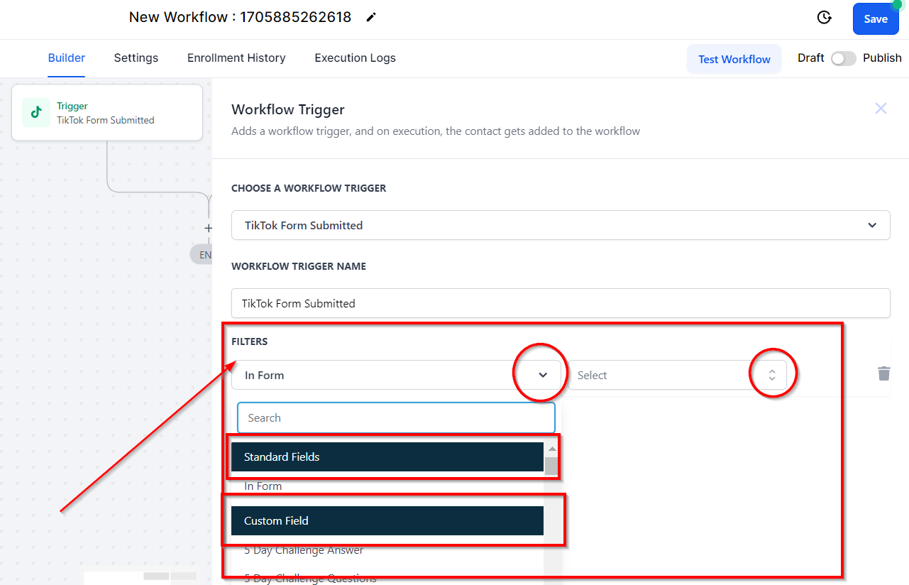 If you are running multiple lead forms on TikTok and need to narrow down your workflow trigger, click on All Filters and select βIn Formβ filter from the dropdown menu. Here youβll be able to select the lead form that you would like to trigger the workflow.