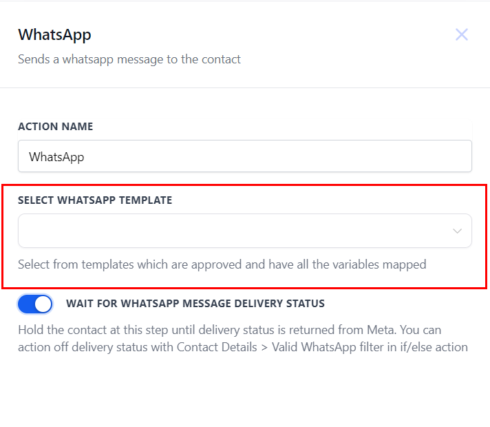6. Choose to send a WhatsApp message using either a pre-designed template or a manual text with custom variables.