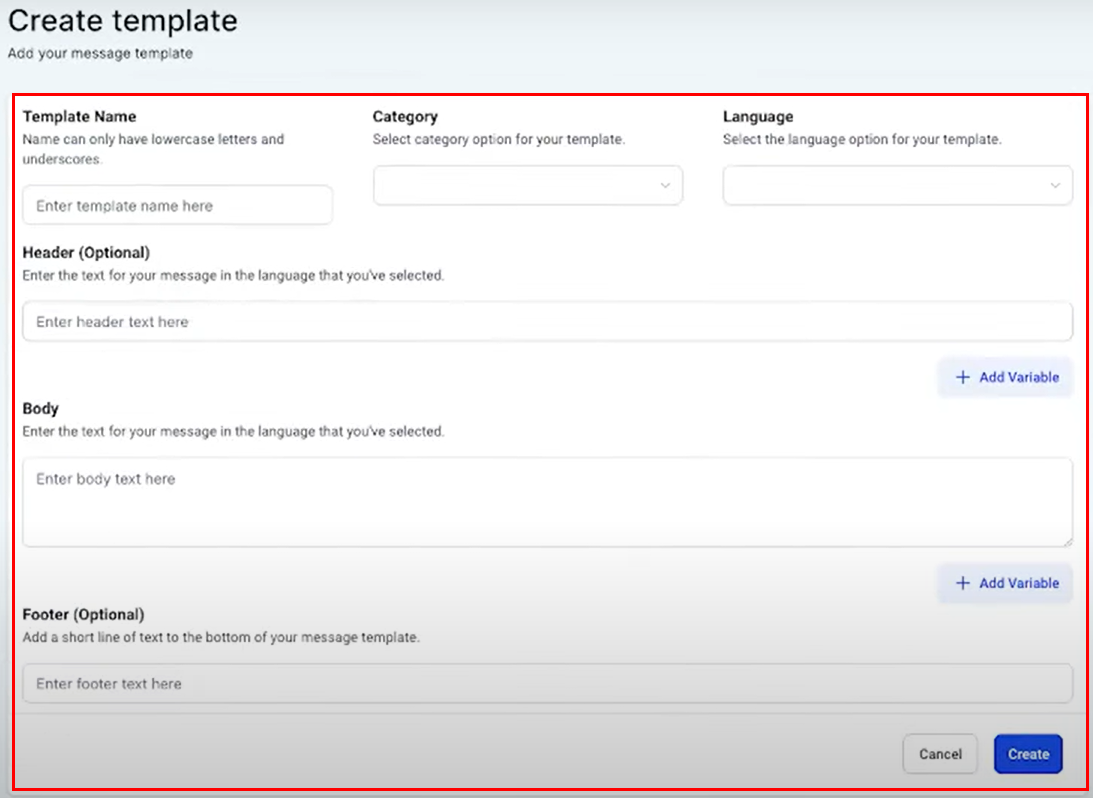 5. Add a header, body text, and footer to your template. You can incorporate custom variables (e.g., contact's first name) to personalize the message.