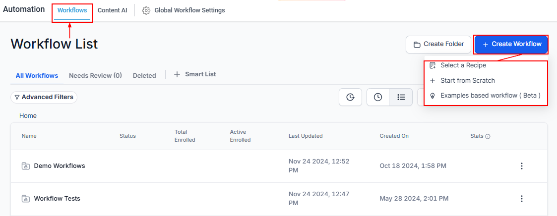 Navigate to the automation section in the CRM and select “Create Workflow.” Choose between starting from scratch or using a pre-designed template. For this guide, we’ll start fresh. Enable Allow re-entry in the settings if your product is likely to be purchased repeatedly.