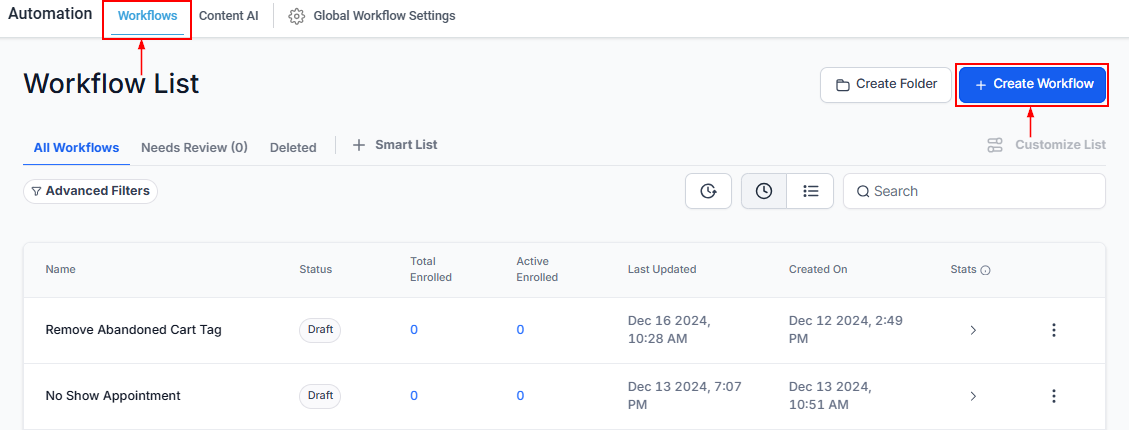 Navigate to Automation > Workflows > + Create Workflow.