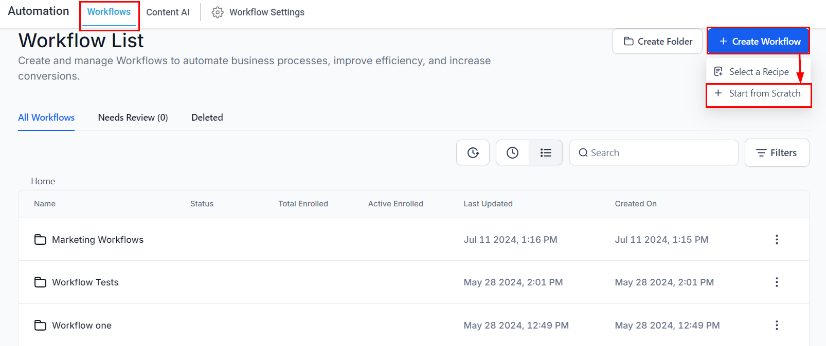 Go to Automation: In the CRM, navigate to the Automations tab and select โWorkflows.โ