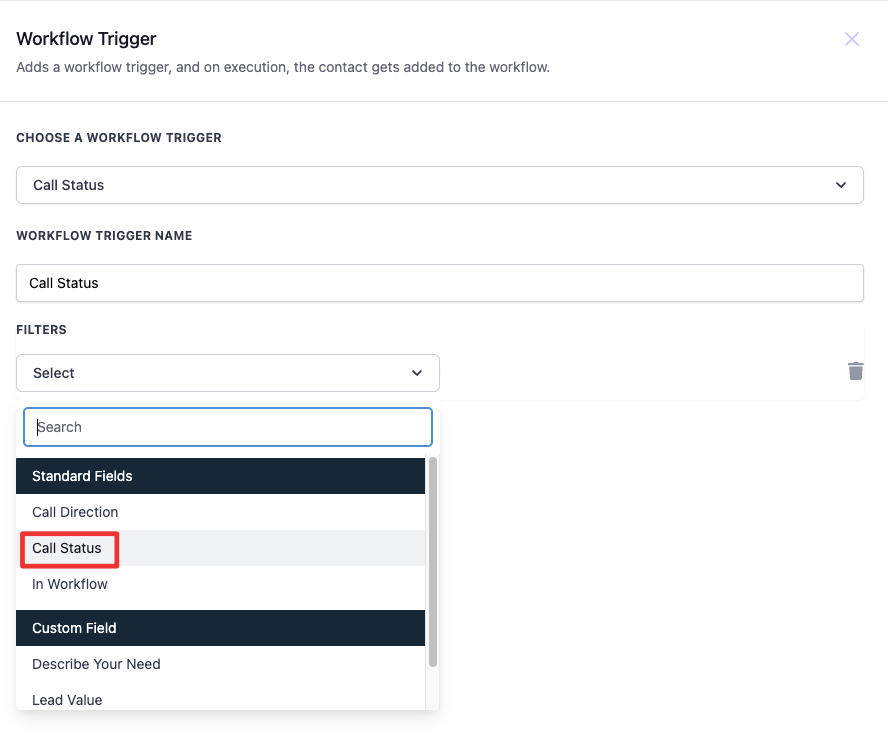 Add a Call Status Trigger: Incorporate a "Call Status" trigger and apply a filter for the specific call status you're targeting (e.g., answered calls).