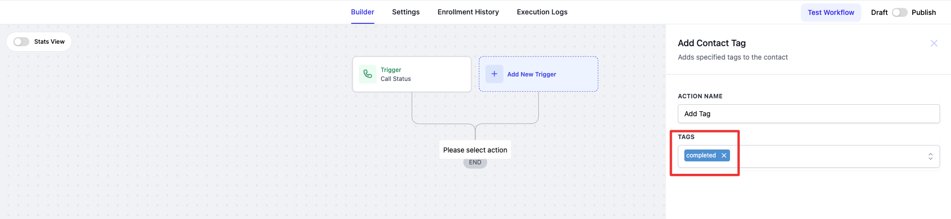 Use an Add Tag Action: Implement an "Add Tag" action to label the contact with a tag that corresponds to the call status (e.g., "completed").