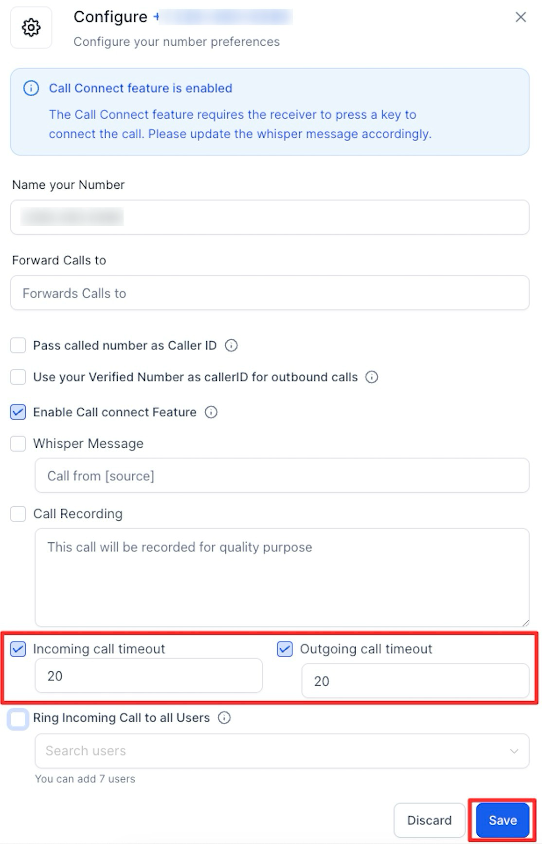 Configure Call Timeout: Find the phone line you wish to adjust and set the 'Call timeout' to 20 seconds. This adjustment helps to prevent voicemail boxes from being recognized as 'answered calls.'